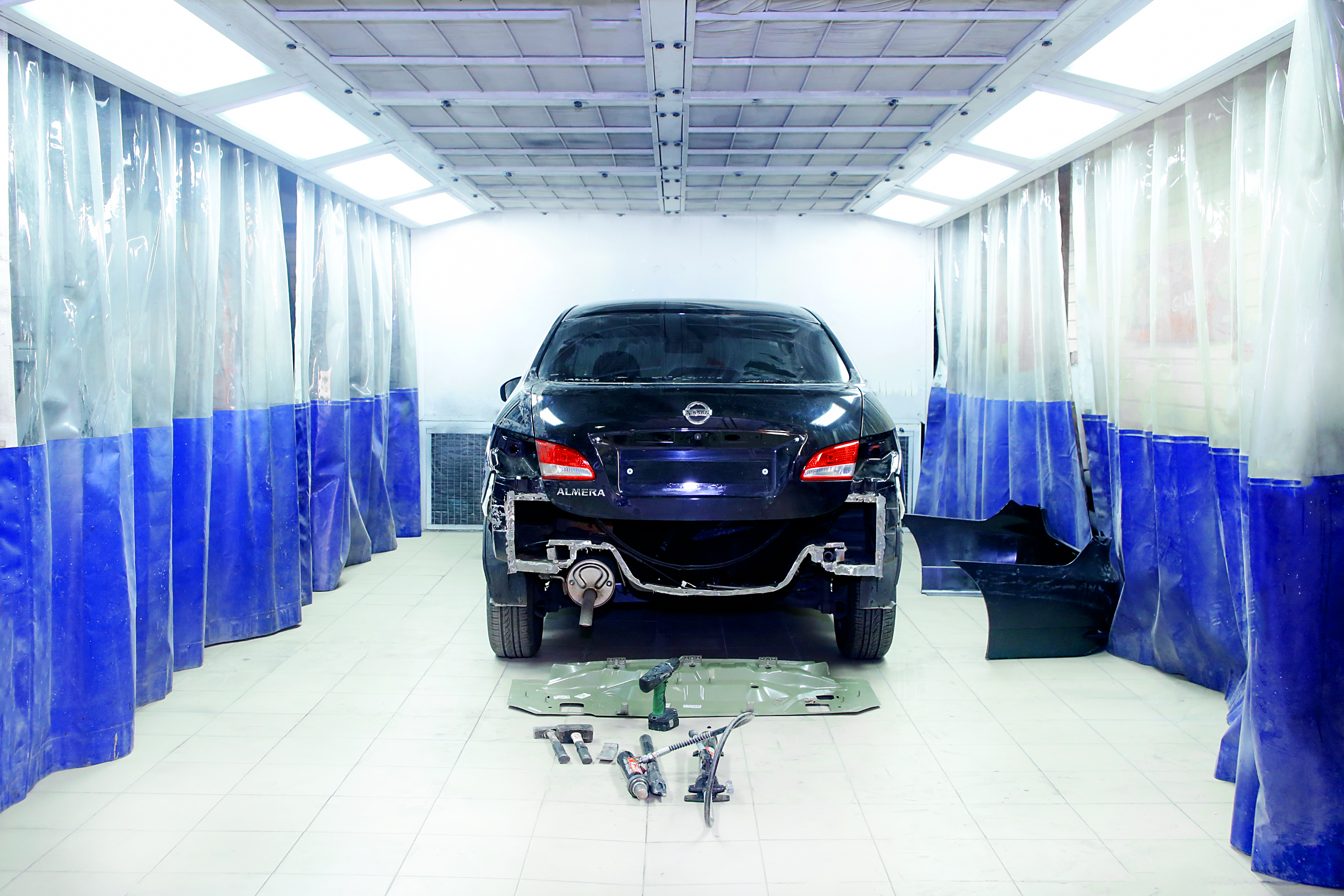 Кузовной цех: подъемник (5т), стапель (2 башни по 10т), Подготовка, камера, коллористика, спец. инструмент.